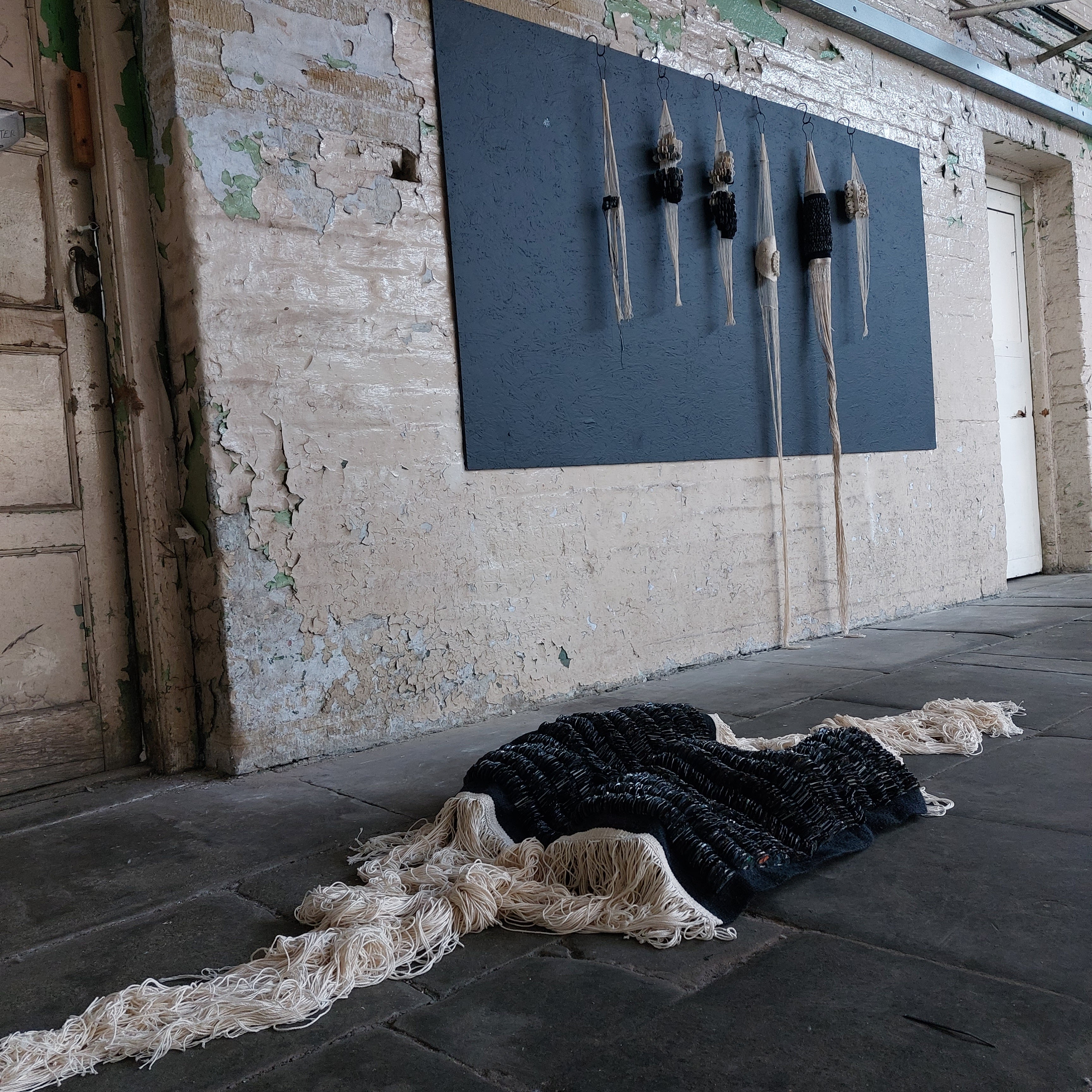 My work is situated at the back of the roof-space and is split into three sections. The first focusses on my site-responsive work from 2017-2022 (titled Retrospective Works) and exemplifies how ‘making as learning’ is inherent within my practice. The three tapestries function as signposts marking key thematic shifts within this five-year period. The two smaller works show how the work evolved from paper to the introduction of cast resin, highlighting a shift to linking materials to the site. Significantly, the works underwent iterative transformations, with completed pieces being revisited and reworked months, and then years later, as ideas evolved and ultimately found resolution in the larger piece.
